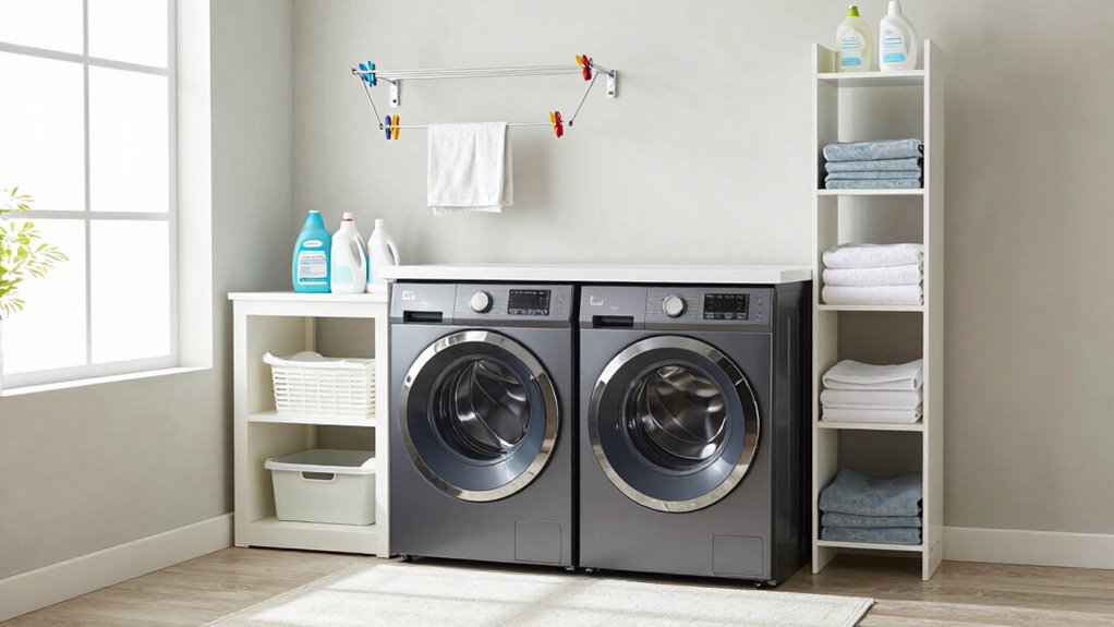 Next, pay attention to your drying rack placement. If you prefer air drying certain clothes, find a spot that’s both practical and well-ventilated. Ideally, set up your drying rack near a window or an exhaust fan to allow for proper airflow. Make sure it’s positioned where it won’t block pathways or interfere with door swings. Placing the drying rack in a convenient location means you’re more likely to use it regularly, reducing reliance on the dryer and saving energy. If space is tight, consider a foldable drying rack that can be tucked away when not in use. This helps you keep your laundry zone tidy and flexible, adapting to different needs and sizes of loads. Thinking about the layout of your laundry zone also involves considering how your appliances are arranged. Position your washer and dryer close together to minimize the distance you walk back and forth with laundry baskets. If possible, place them side by side or stacked in a way that maximizes your available space. This setup makes transferring clothes from washer to dryer quick and effortless, which keeps the process moving smoothly. It also leaves room for other essentials like a laundry basket or folding surface nearby.
