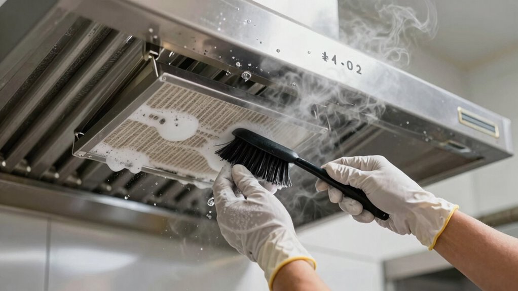 Keeping your range hood and filters clean is crucial for maintaining good air quality and guaranteeing your kitchen stays fresh. Your range hood plays an essential role in kitchen ventilation by removing cooking fumes, smoke, and odors that accumulate during meal prep. When these fumes build up on filters, they not only hinder airflow but can also become a source of persistent grease and grime. Regular cleaning keeps your ventilation system functioning efficiently, reducing the risk of unpleasant smells and airborne pollutants.
