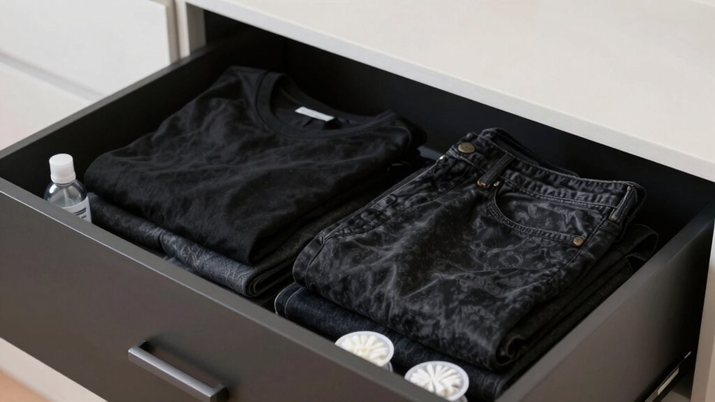 To keep your black clothes from fading in the wash, turn them inside out and wash in cold water on a gentle cycle to reduce friction and color loss. Use a detergent formulated for dark clothes, and avoid over-washing. Air-dry in the shade or use low heat if you dry in a machine, which helps preserve vibrancy. Proper storage and handling also matter, so follow these tips for longer-lasting black clothing. Keep going to discover even more easy ways to protect your wardrobe.