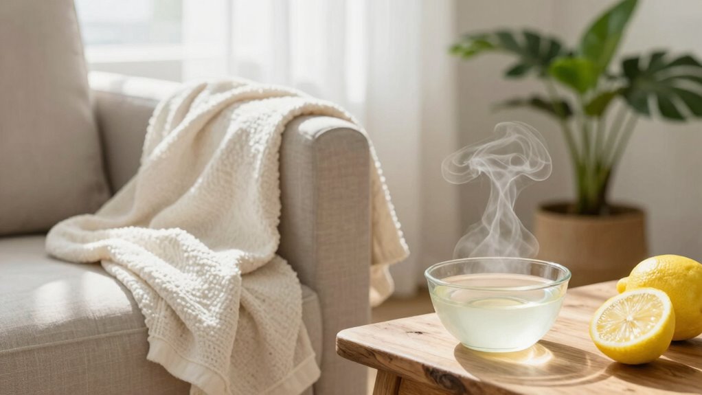 To remove smoke smells from fabric at home, start by airing items outdoors in the fresh air for several hours, and sprinkle baking soda over the surfaces, letting it sit for at least 15 minutes before vacuuming thoroughly. Lightly spray with a mixture of equal parts vinegar and water, then gently wipe or rinse with a damp cloth. Using odor absorbers like activated charcoal and ensuring good ventilation can also help. For more effective tips, keep exploring these simple methods.