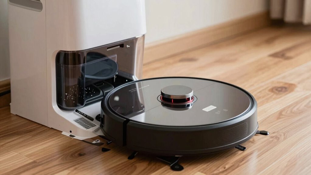 Have you ever wished your robot vacuum could take care of its own messes without your help? If so, self-emptying robot vacuums might just be the solution you’re looking for. These devices are designed to reduce the hassle of regular maintenance, giving you more time to enjoy your clean home. At the core of their convenience is their ability to automatically empty their dustbins into a larger, sealed container, often located in a docking station. This means you won’t have to constantly monitor or manually empty the vacuum, which can be especially helpful if you have pets or a busy schedule. When considering these vacuums, one of the first things to look at is battery life. Self-emptying models typically come with robust batteries, allowing for longer cleaning sessions before needing a recharge. A longer battery life ensures that the vacuum can cover more ground in a single run, making deep cleans more effective and reducing the number of times it needs to return to its dock. This is particularly advantageous if you have a large home or areas that are hard to reach with shorter battery spans. The combination of extended battery life and automatic emptying means you can set your vacuum to work and forget about it until the job’s done. Additionally, advancements in robotic cleaning technology continue to improve the efficiency and effectiveness of these devices, making them an increasingly popular choice for modern households. The development of smart home integration features also enhances their usability, allowing you to control and monitor your vacuum remotely. Regular updates and improvements in robotic navigation contribute to better cleaning performance, ensuring comprehensive coverage and fewer missed spots. Incorporating air quality monitoring features into some models further enhances their value, as they can help identify areas with poor air circulation or dust accumulation. These technological improvements highlight the importance of systematic cleaning patterns in achieving thorough and consistent results. Another essential feature is the variety of cleaning modes available. Many self-emptying robot vacuums offer multiple cleaning options, from general spot cleans to deep cleaning cycles. Some models even include specialized modes for pet hair, carpets, or hard floors. With adjustable cleaning modes, you can customize the vacuum’s performance based on your specific needs, guaranteeing a thorough clean every time. This flexibility becomes even more useful when paired with the self-emptying function, as it allows the vacuum to adapt to different environments without manual intervention. Whether you want a quick daily tidy or a deep clean after a gathering, these modes give you control and convenience.