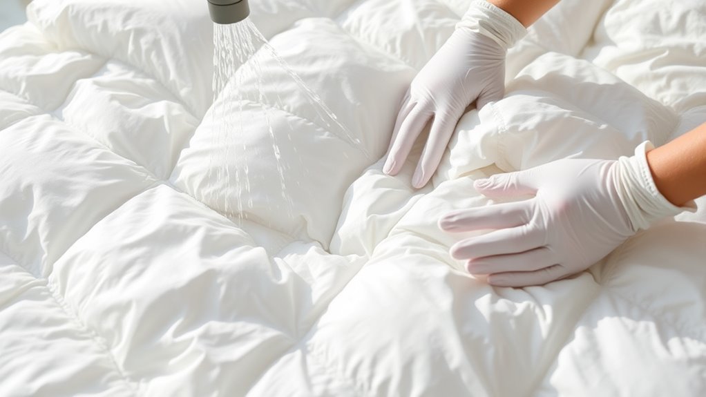 To prevent mold growth in your down comforter, you should focus on mold prevention through proper comforter maintenance. Always guarantee your comforter stays dry and well-ventilated, especially after washing. Use a dehumidifier in humid spaces, and avoid storing it in damp areas. Regularly fluff and air out your comforter to keep moisture away. These steps help maintain a fresh, mold-free down comforter for longer, ensuring comfort and hygiene.