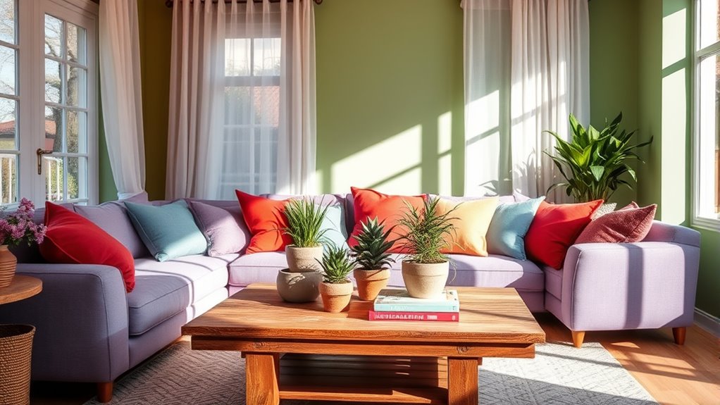 To make small spaces feel larger and more inviting, use color accent walls to create focal points without overwhelming the room. Incorporate strategic lighting to enhance the mood and highlight your chosen colors. Light, cool hues like blues and greens can make a space feel more open, while warm shades add coziness. Balance these elements to evoke the desired emotions and make your small space feel thoughtfully designed and comfortable.