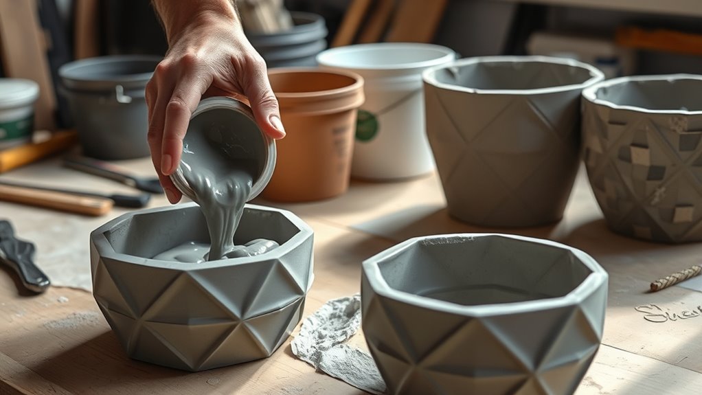 The process begins with selecting the right mold, which can be anything from simple cardboard boxes to more elaborate forms like plastic containers or custom-built wooden frames. Your mold choice influences the final look, and for an industrial feel, consider using reclaimed or rough-textured molds that add character. When mixing your concrete, aim for a consistency that’s thick enough to hold shape but workable enough to pour smoothly. You’ll want to incorporate sustainable materials—such as fly ash or slag—into your mix to reduce environmental impact. These materials not only make your project greener but can also enhance the durability and texture of your planters, giving them that rugged, industrial vibe.