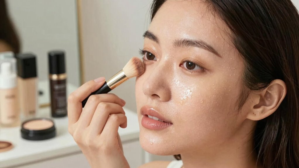 When your skin’s texture is smooth, hydrated, and free of excess oil, skipping primer can be a time-saver without sacrificing your natural look. Textured skin, with visible pores or unevenness, often leads to the misconception that primer is always necessary. However, primer myths suggest it’s essential for every skin type, which isn’t true. If your skin is well-prepped and your natural texture isn’t pronounced, you can confidently skip primer and still achieve a flawless appearance. This saves time and simplifies your routine. Keep in mind, skipping primer isn’t ideal if you have large pores or uneven skin, but for many, embracing their natural texture without primer can look just as polished.