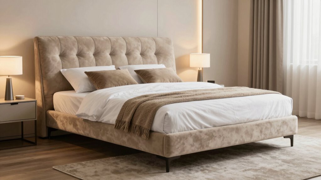 Yes, there are height restrictions for your bedroom furniture. You should consider furniture height to guarantee it fits comfortably with your adjustable base, promoting better bedroom ergonomics. Low-profile dressers and bedside tables work well, especially if your bed is adjustable, to prevent obstruction or difficulty in reaching. Always measure your space carefully and choose furniture that complements your bed’s height, creating a functional and comfortable environment.