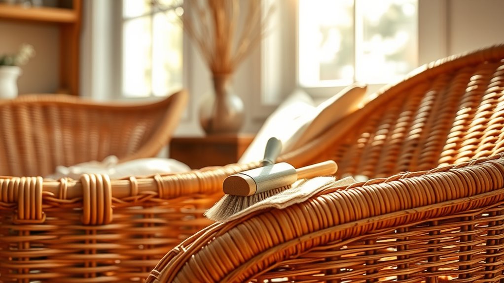 To prevent mold and mildew buildup, you should keep your furniture dry and well-ventilated. Regularly wipe down the surfaces with a damp cloth and make certain no moisture remains in crevices. Applying a mold prevention spray can help, and you should also store your rattan or wicker furniture in a dry, shaded area during rainy seasons. Consistent mildew control keeps your furniture looking fresh and extends its lifespan.