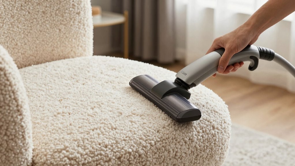 Yes, you can clean bouclé fabric with a vacuum brush attachment. Use gentle vacuum techniques to avoid damaging the delicate fibers, and choose a soft-bristled brush attachment to prevent matting. Lightly vacuum the surface in a consistent, gentle motion to remove dust and debris effectively. Always test a small, hidden area first to make certain the brush selection and vacuum techniques won’t harm your bouclé furniture.