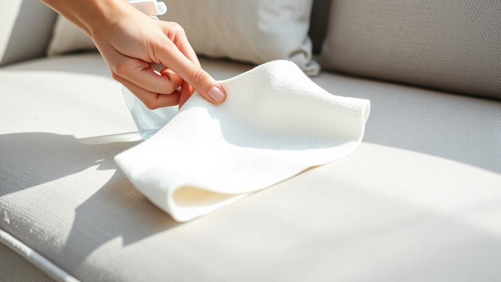 To clean your microfiber sofa, start by vacuuming with an upholstery attachment to remove loose dust and debris. Use a soft-bristled brush and a damp microfiber cloth for surface dust and light cleaning. For stains, gently blot with a microfiber cloth and a solution of mild dish soap and water, working from outside the stain inward. Avoid over-wetting and always test solutions first. With proper techniques, you can keep your sofa looking fresh—learn more for expert tips.