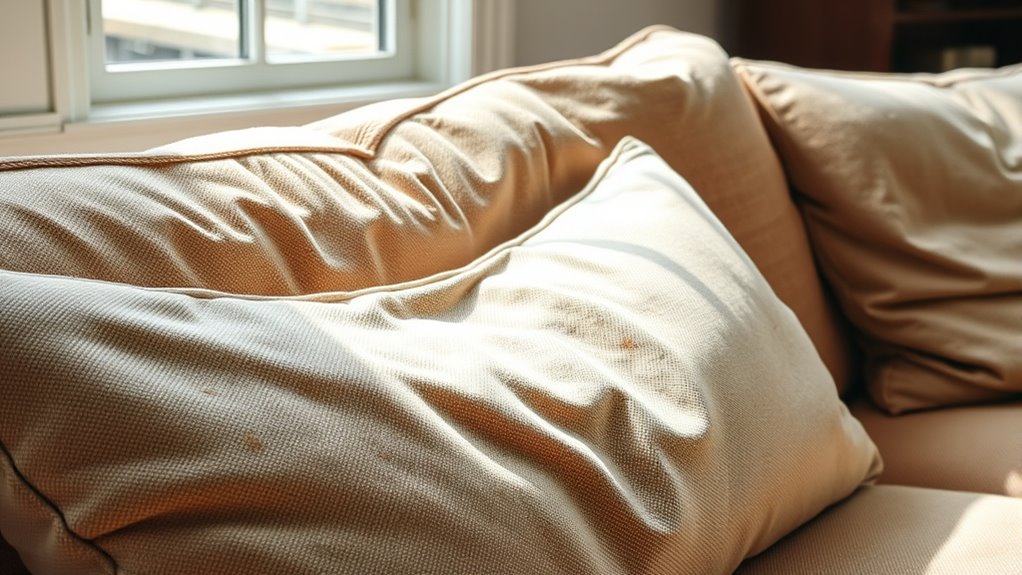 You can prevent future sagging by choosing the right cushion stuffing options like foam, down, or polyester fiberfill, which offer better support and durability. Regularly flipping and rotating your cushions also helps maintain their shape. Consider cushion cover replacement if covers are worn out or loose, as this can improve support and appearance. Taking these steps guarantees your couch stays comfortable and looking great longer.