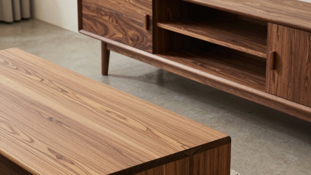 Mixing finishes can make your furniture look more modern or traditional, depending on your approach. If you use finish contrast thoughtfully, you add visual interest and depth, perfect for a modern vibe. For a traditional look, stick to color coordination with similar tones or wood types. By balancing these elements, you create a cohesive style that reflects your personality, whether sleek and contemporary or warm and classic.
