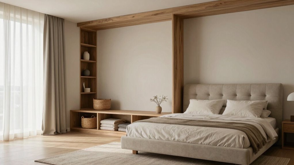 If you’re looking to maximize space and reduce clutter in your retreat bedroom, storage beds offer a practical solution. These beds are designed to blend functionality with style, making them ideal for creating a calm, clutter-free sanctuary. In retreat-style bedrooms, where relaxation and simplicity are key, a storage bed helps you keep essentials out of sight but easily accessible. You can tuck away extra bedding, clothing, or books under the bed, freeing up valuable space and maintaining a clean, serene environment. This approach aligns perfectly with the minimalist ethos of retreat aesthetics, emphasizing simplicity without sacrificing comfort. Incorporating luxury materials elevates storage beds from merely functional to indulgent pieces of furniture. When you choose one crafted from high-quality woods, upholstered in soft fabrics, or featuring elegant finishes, you create a sense of opulence even within a compact space. The use of luxury materials not only enhances durability but also adds a tactile richness that makes your retreat bedroom feel more refined. The combination of aesthetics and practicality ensures that your storage bed becomes a statement piece — one that invites you to relax in style, knowing your space is both beautiful and efficient. Space optimization is at the heart of why storage beds work so well in retreat bedrooms. These beds are designed to maximize every inch of available space, often featuring built-in drawers, lift-up mattresses, or hidden compartments. Smart design features such as these help you make the most of your space without sacrificing style. Incorporating multi-functional furniture into your retreat space can further enhance its functionality and appeal. This integrated approach streamlines your room, creating an open, airy feel conducive to relaxation. You don’t have to sacrifice comfort for functionality; instead, you get both in a sleek, cohesive design. In a retreat bedroom, where tranquility and organization go hand-in-hand, storage beds serve as a smart, stylish solution. They can also incorporate innovative storage solutions, making it easier to keep your space organized and clutter-free. They help you maintain a clutter-free environment, which is essential for unwinding after a long day. Choosing a storage bed that incorporates luxury materials ensures your retreat space feels cozy and inviting, while its space-saving features give you more room to breathe and move. Incorporating space-saving furniture can further enhance the overall harmony of your retreat sanctuary. Ultimately, these beds transform your bedroom into a peaceful haven, combining practicality with understated elegance.