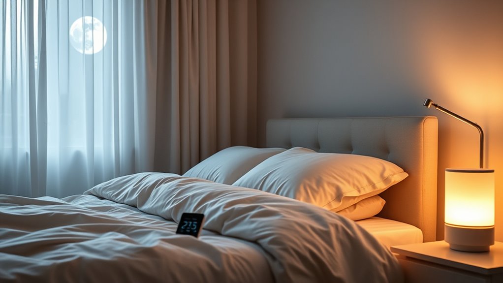 You might notice that room temperature regulation greatly impacts your REM sleep patterns. When your room is too hot or cold, it can disrupt your body’s ability to enter and sustain REM sleep stages. Ideally, keeping your bedroom around 60-67°F helps promote ideal REM sleep quality. By maintaining a comfortable temperature, you support better sleep cycles, allowing your brain and body to fully rest and recover each night.