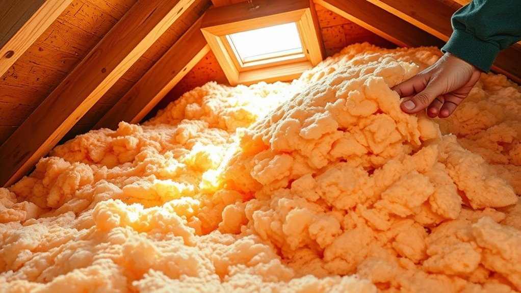Attic insulation can boost your home’s resale value by improving energy efficiency and thermal comfort. When you upgrade your insulation, buyers see lower energy bills and a more comfortable living space, making your home more attractive. It shows you’re proactive about home maintenance, which adds appeal. Plus, well-insulated attics help prevent drafts and temperature fluctuations, making your home stand out in the market and potentially increasing its value.