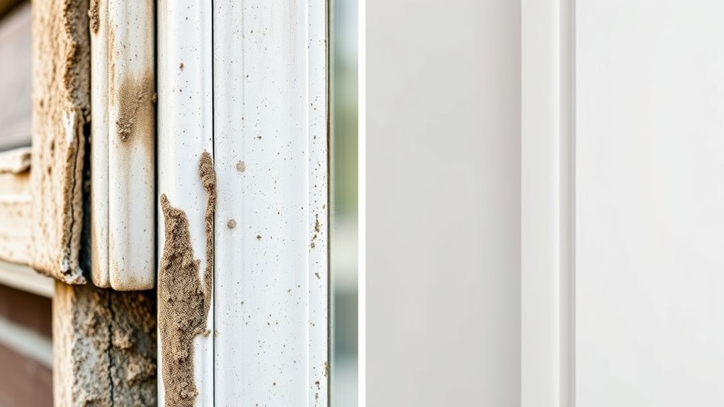 When you’re sealing gaps around windows and doors outside, exterior caulk is your best choice. Its weather resistance means it can handle rain and UV rays without breaking down, protecting your home from drafts, water intrusion, and pests. You’ll notice that exterior caulk tends to be more elastic, allowing it to expand and contract with temperature changes, which is vital in preventing cracks and leaks. The adhesion properties are also superior for rough or uneven surfaces typically found outdoors, ensuring a secure, long-lasting seal even in challenging conditions.