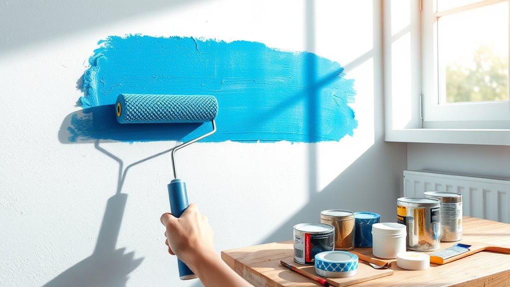 Imagine a smooth, flawless wall radiating color—you’re equipped with essential tools. You’ll need high-quality brushes for precise brush techniques, ensuring clean edges and even coverage. A sturdy paint storage container keeps your paint fresh and accessible. Add a roller for large areas, painter’s tape for crisp lines, and a putty knife for imperfections. With these tools, you’ll achieve a professional finish that transforms your space effortlessly.