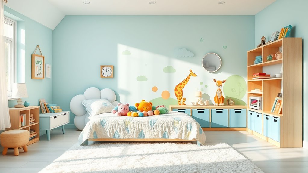 You can maximize storage by using under bed storage containers for toys and clothes, keeping the floor clear. Wall-mounted shelves provide easy access to books and decor, while freeing up surface space. Incorporate multi-functional furniture like beds with built-in drawers. Keep clutter at bay by regularly sorting items and using labeled bins. This approach keeps your kids’ room organized, spacious, and visually appealing without feeling crowded.