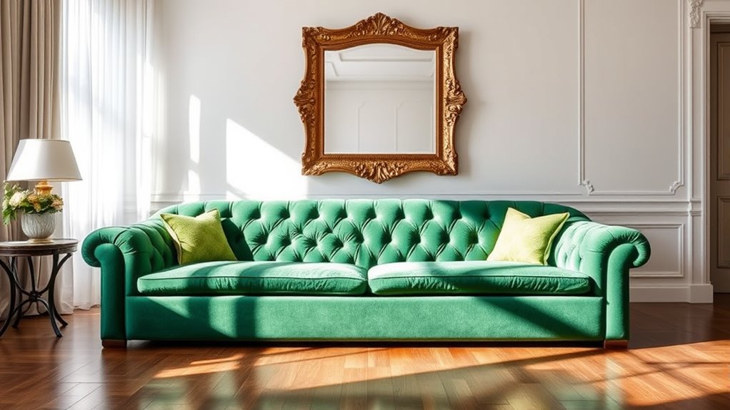 You should balance multiple focal points by creating visual symmetry with your arrangement, ensuring no single element overwhelms the space. Use color contrast strategically to differentiate focal points, guiding the eye naturally around the room. Keep the scale and placement in harmony, so each focal point complements the others without competing. This approach helps your large space feel cohesive and inviting, with a well-balanced visual flow.