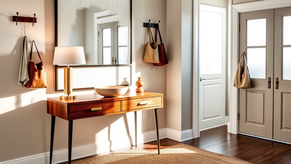 You should incorporate ambient fixtures like ceiling-mounted lights or wall sconces to create a warm, inviting glow. Add task lighting, such as a stylish table lamp or a focused pendant, near key areas like the coat rack or mirror for functionality. Combining these options enhances both the ambiance and practicality of your entryway, ensuring it’s welcoming and easy to navigate every day.