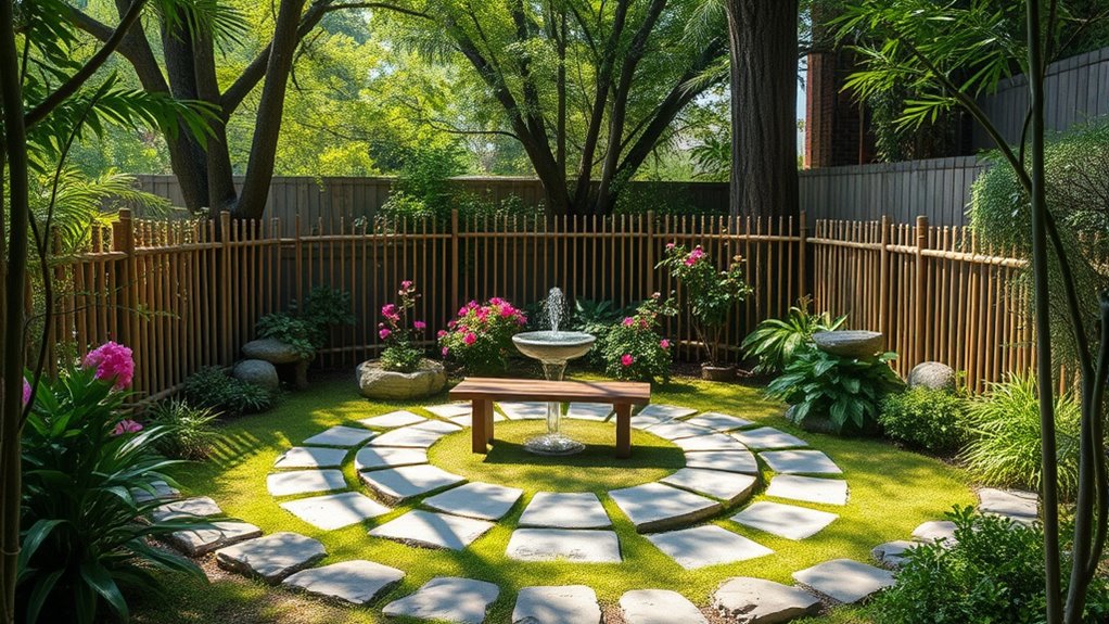 To create a backyard meditation spot, find a quiet, secluded area away from noise, ideally near natural elements like trees or water. Enhance the space with simple accessories such as comfortable seating, stones, lanterns, and potted plants to promote tranquility. Install privacy fencing or natural barriers to keep outside distractions out. Adding gentle sensory elements like wind chimes and focal art can deepen relaxation. Keep the space inviting and personalized—explore further to craft your perfect outdoor retreat.