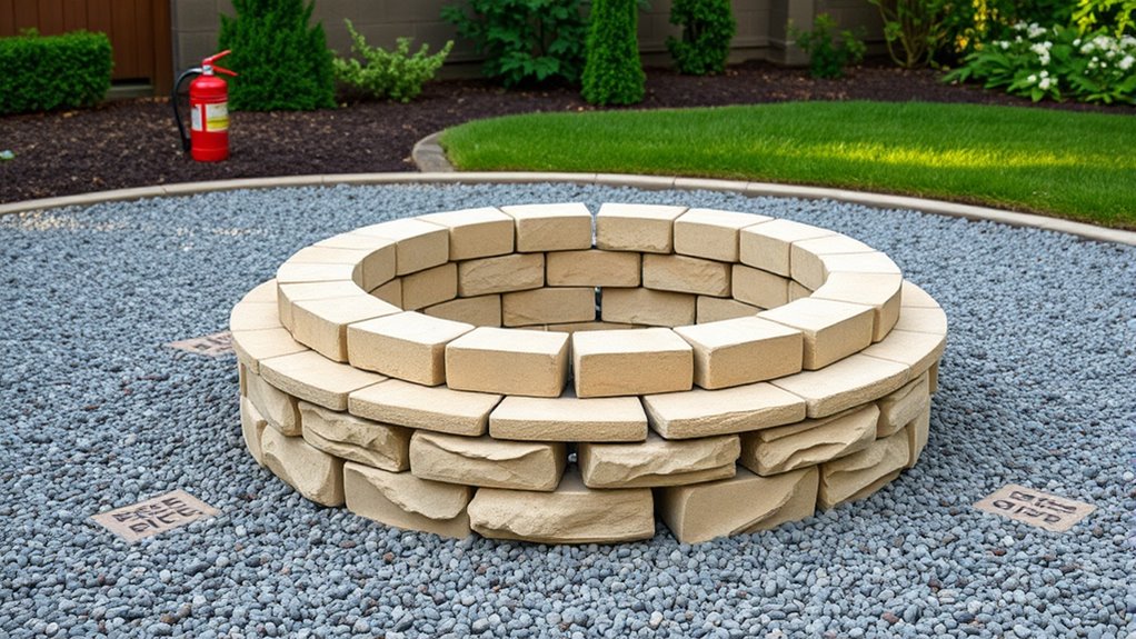 Once you’ve selected your materials, focus on designing your outdoor fireplace design with safety in mind. The size and shape matter—keep the fire contained by choosing a shallow, wide bowl or a circular design. Make sure your fire pit is positioned at a safe distance from structures, trees, and overhanging branches. Local codes often specify minimum setback distances, so check your area’s regulations before you start building. A good rule of thumb is to keep the fire pit at least 10 to 25 feet away from your home or other combustible elements. Additionally, guarantee the surface beneath the fire pit is non-combustible, like gravel or concrete, to prevent accidental fires. Using fire-resistant materials ensures your fire pit remains safe during use.