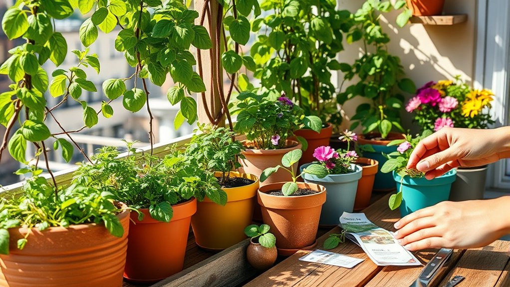 Container gardening is perfect for beginners looking to grow plants indoors or outdoors. Start by choosing the right containers with drainage holes and match them to your plants’ needs. Use quality soil, water consistently, and select plants suited for your light conditions. Keep pests in check and arrange your garden thoughtfully. As you develop your skills, you’ll discover more tips for success—keep exploring to turn your container garden into a thriving space.