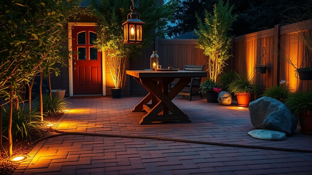 To add outdoor lighting to your paths and patios, focus on safety and ambiance by placing lights along walkways with 3-4 feet spacing and highlighting key features like gardens or water elements. Use solar fixtures for eco-friendly, easy-to-install options that shed a warm glow without glare. Layer different styles, such as string lights or spotlights, to create depth and inviting atmospheres. Keep in mind lighting placement and adjustment to make certain a well-lit, beautiful outdoor space—discover more tips to perfect your setup.