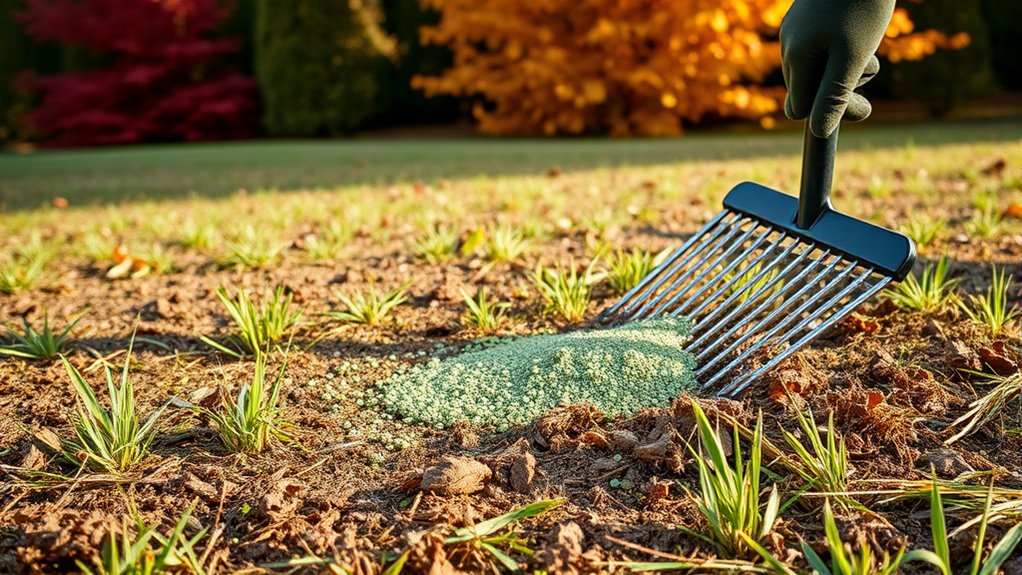 In fall, improve your lawn by choosing cool-season grasses like fescue or Kentucky bluegrass. Clear debris, aerate the soil, and rake thoroughly to guarantee good seed-to-soil contact. Spread the overseeding seed evenly, then cover lightly with soil or compost. Water immediately and keep the soil moist, providing gentle, frequent watering to encourage germination. Proper prep and care lay the foundation for a lush, healthy lawn—continue to learn how to maximize your success.