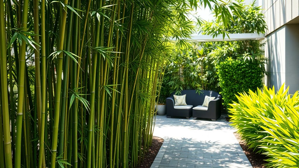 To design effective windbreaks and privacy screens, you should combine sturdy materials with strategic plantings. Use durable options like pressure-treated wood, metal, or vinyl panels for structure, and incorporate evergreen shrubs or fast-growing plants such as bamboo for natural coverage. Pairing these elements creates a resilient, attractive barrier that blocks wind and enhances privacy year-round. Choosing the right combination depends on your climate and maintenance preferences—continue to explore for tailored tips to perfect your outdoor space.