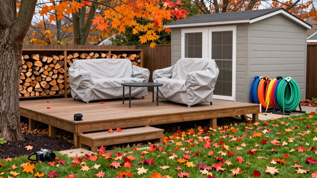 To winterize your outdoor space in just one weekend, start with a thorough inspection of plants, furniture, and drainage systems. Protect sensitive plants by bringing them indoors or covering them, and apply mulch around garden beds. Insulate decks and structures with sealants or foam boards. Clean and cover patio furniture, and make certain outdoor lighting and tools work properly. Planning spring cleanup now will facilitate your shift smoother later. Keep exploring for more tips to make your winter preparation even easier.