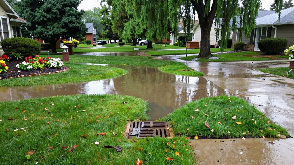 Think of eco-friendly stormwater management solutions as nature’s gentle sponge. Yes, there are environmentally friendly drainage options like rain gardens, permeable pavers, and green roofs that absorb and filter runoff naturally. These solutions reduce flooding and protect water quality without harm. You’ll find that implementing eco-friendly options not only benefits your yard but also supports local ecosystems, making your landscape resilient and sustainable in the long run.