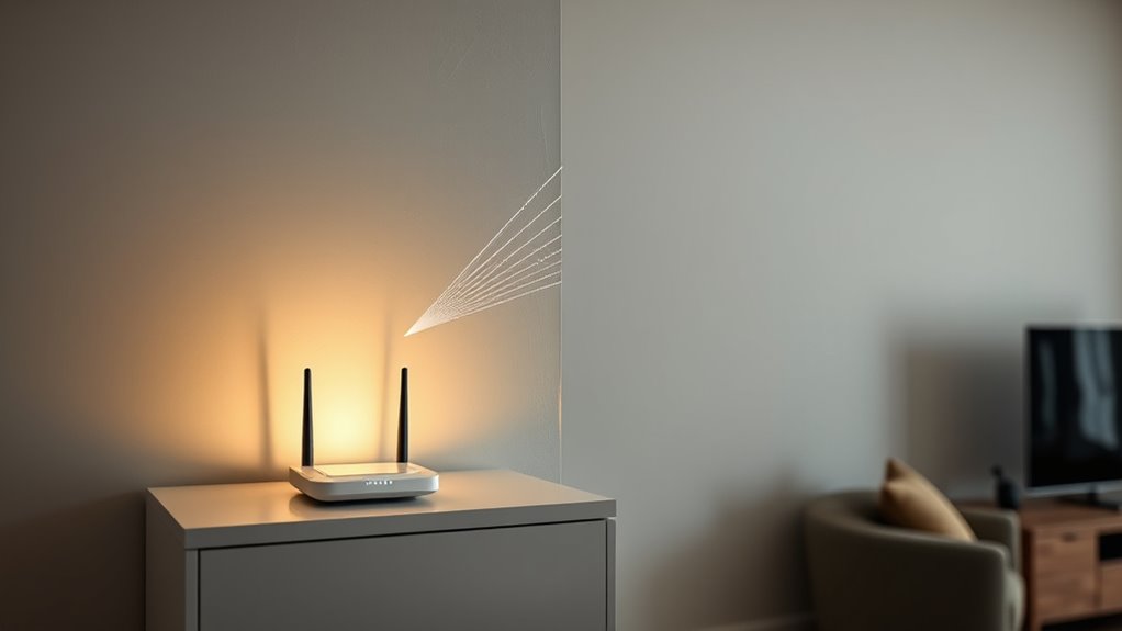 Wall thickness also matters; thicker walls weaken signals more. Keep your router away from dense materials and avoid placing it behind large furniture or appliances. By reducing these physical obstructions, you enhance Wi-Fi coverage and ensure a more reliable connection throughout your space. Additionally, understanding the building materials in your walls can help you plan the optimal placement for your router.