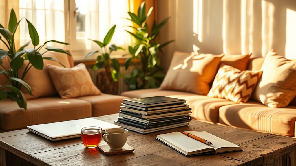 To truly disconnect, you need to establish a dedicated digital-free zone in your home where devices are off-limits. Creating tech free zones helps you set clear boundaries, making it easier to resist the urge to check your phone or laptop. Designate specific areas, like a cozy corner or a dining space, where no screens are allowed. These device free zones become your sanctuary for relaxation and presence. Keep these zones inviting and comfortable, encouraging you to spend time without digital distractions. By intentionally setting up spaces free of technology, you reinforce your commitment to a digital detox. Incorporating celebrity lifestyle insights can also inspire you to create personalized and stylish retreats that support your goals. This simple step helps you reclaim your space, reduce temptation, and foster genuine connections with those around you.