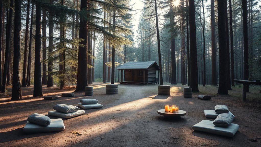 To prepare mentally for a silent retreat, start practicing mindfulness regularly to build your focus and awareness. Cultivate emotional resilience by acknowledging your feelings without judgment, which helps you handle challenges during silence. Set clear intentions for your retreat, and gradually reduce distractions beforehand. Visualize a peaceful experience, and remind yourself that this time is for self-care and growth. This mental prep will help you fully embrace the retreat’s benefits.