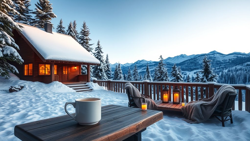 Beyond the outdoors, you can craft a cozy indoor haven through hygge escapes. The Danish concept of hygge centers around creating warm, inviting spaces that foster comfort and contentment. To achieve this, gather soft blankets, plush pillows, and candles to set a soothing ambiance. You might prepare a hot cocoa station or bake some fresh cookies to fill your retreat with comforting aromas. Curl up by a crackling fire or under a thick throw while reading a good book or sharing stories with loved ones. Hygge escapes are about slowing down and relishing simple pleasures, turning your retreat into a sanctuary of calm and coziness. Incorporating cozy indoor activities such as crafting or board games can further enhance your experience and promote relaxation. These moments of quiet relaxation help you recharge mentally and emotionally, making your winter getaway restorative and fulfilling.