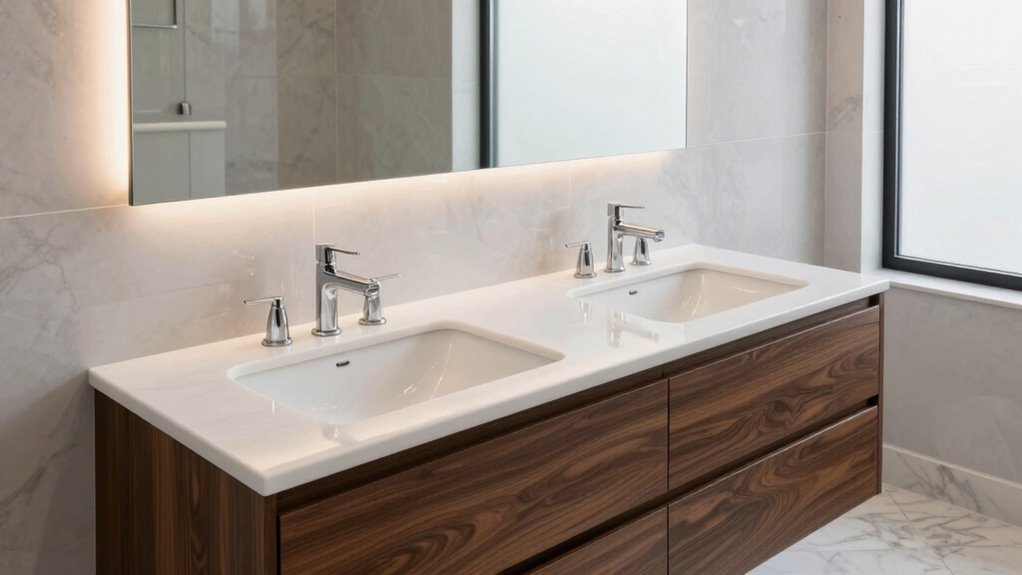 To keep your double sink bathroom vanity looking its best and functioning properly, maintenance is essential. I recommend choosing vanities with water-resistant finishes and moisture-resistant materials like engineered wood or MDF to withstand humidity. Regular cleaning with non-abrasive, mild cleaners helps preserve the surface and prevents soap scum and stains. Make sure sinks and countertops are sealed properly to avoid water seepage, which can cause warping or mold growth. Soft-close hinges and drawers reduce wear and tear, extending hardware life. Periodically inspect and tighten hardware, and address any damage promptly to maintain both functionality and appearance. Consistent maintenance not only prolongs your vanity’s lifespan but also keeps your bathroom looking fresh and well-kept.