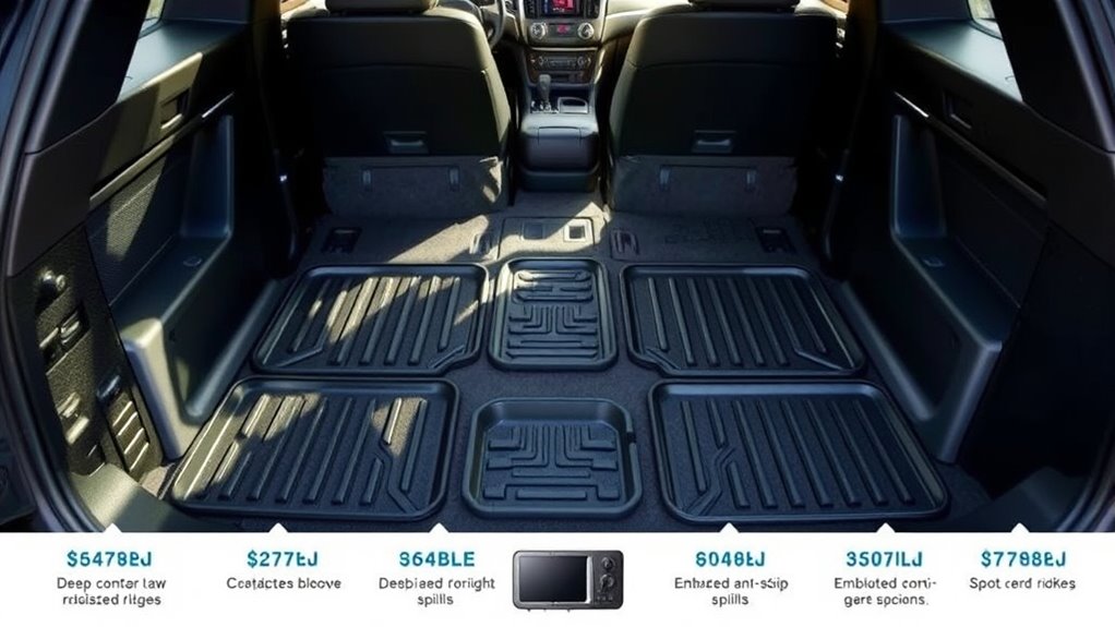 To make certain your SUV’s interior stays protected in all weather conditions, it’s essential to focus on the mats’ ability to trap moisture, dirt, and debris effectively. Deep ridges and channels are key, as they prevent water, mud, snow, and debris from spilling onto the carpet. The materials used, like heavy-duty rubber or thermoplastic elastomers, must withstand extreme temperatures without cracking, splitting, or warping. A textured surface or anti-slip backing ensures the mats stay securely in place during driving, especially in wet or icy conditions. Additionally, the ability to trim or customize the mats guarantees a precise fit, providing a more effective barrier against the elements. Durability is crucial, so the mats should maintain their shape and protective qualities over time despite exposure to harsh weather.