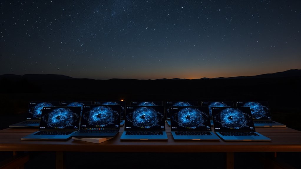 Choosing the right astronomy laptop balances power and portability, much like balancing a telescope’s precision with ease of use. Imagine gazing at the stars, your long-lasting battery fueling your curiosity, while your sleek laptop captures and processes distant galaxies. It’s a perfect blend—technology that keeps up with your passion, whether under a starlit sky or in a busy research lab. Ultimately, the best laptop is the one that fuels your wonder without holding you back.