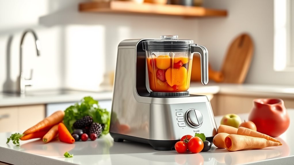 To meet my baby’s changing needs, I look for a baby food maker that offers multiple functions like steaming, blending, and sterilizing. This versatility allows me to prepare a variety of textures, from smooth purees to chunkier bites, as my baby grows. I prefer models with adjustable speed settings and texture controls, ensuring I can customize meals easily. Dual or multi-layer steam baskets are a bonus because they preserve nutrients by steaming ingredients separately or together. Features like auto timers and self-cleaning make meal prep more convenient and less time-consuming. Compatibility with accessories such as storage containers or reusable pouches also expands the device’s usability, letting me prepare, store, and serve meals efficiently. Versatility truly simplifies the process of providing healthy, age-appropriate food.