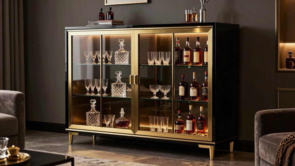 Selecting a bar cabinet that complements your home’s decor is essential for creating a cohesive entertaining space. I recommend matching the cabinet’s style and color scheme to your existing decor, whether it’s rustic, modern, vintage, or industrial. Think about the overall vibe you want—sleek and minimalist or ornate and decorative—and choose a design that aligns with your entertainment preferences. The finish, such as wood grain, matte, or glossy surfaces, should blend seamlessly with other furniture pieces. Pay attention to hardware and door styles, like fluted, glass-paneled, or rattan doors, to enhance visual harmony. Opt for versatile designs and finishes that can fit into multi-purpose rooms, ensuring your bar cabinet complements your entire living area effortlessly.