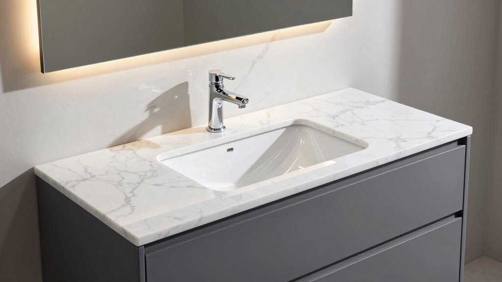I find that quartz, granite, and marble are the most durable materials for bathroom vanity countertops. Quartz is especially tough because it’s engineered, resistant to scratches and stains. Granite offers natural strength and unique patterns, while marble, though elegant, requires more maintenance. I recommend quartz for its durability and low upkeep, making it a great choice if you want longevity without sacrificing style.