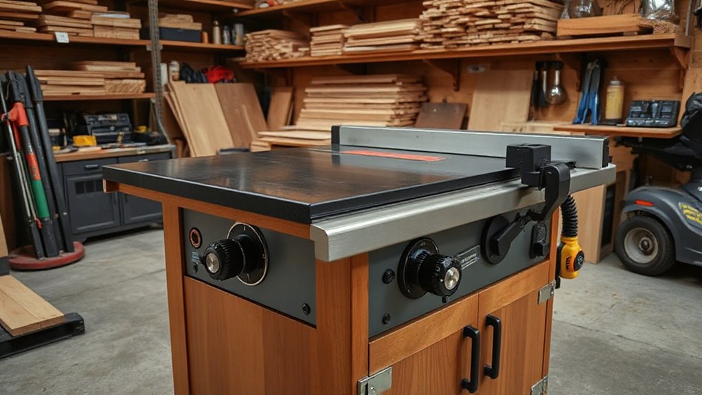 To maintain safety features on my cabinet table saw, I regularly inspect and clean all safety devices like blade guards and riving knives to make certain they’re in proper working order. I also check that emergency stop buttons function correctly and keep the area clear of debris. Additionally, I follow the manufacturer’s guidelines for maintenance and replace worn or damaged parts promptly to keep my saw as safe as possible.