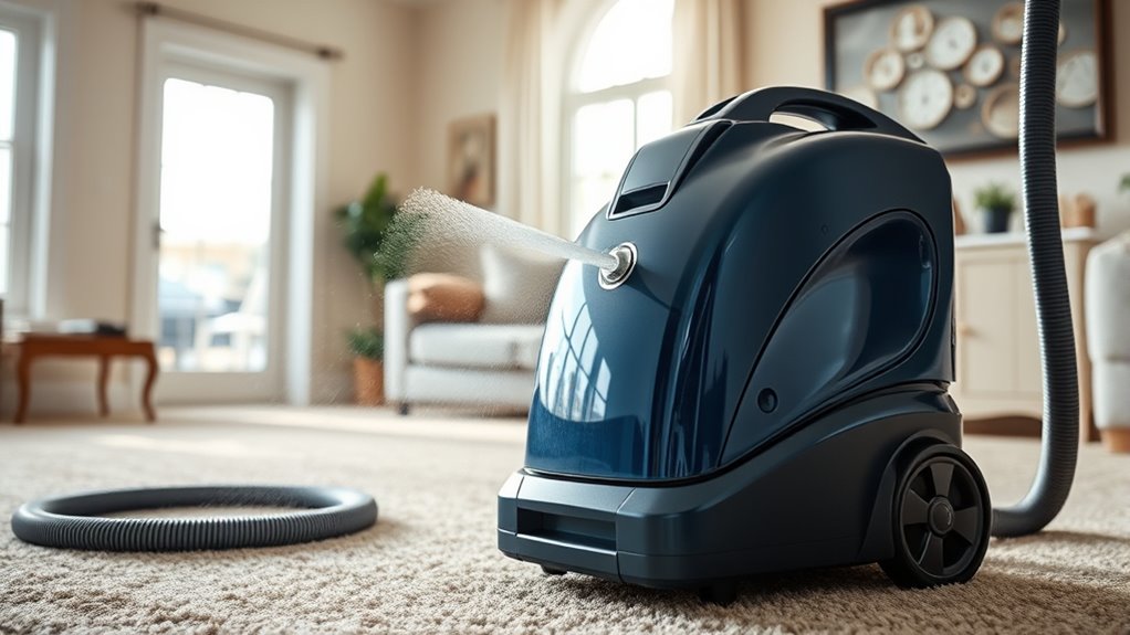 Choosing a commercial carpet extractor for home use hinges on its cleaning power, which depends on several key factors. Suction strength, pump pressure, and brush agitation work together to lift embedded dirt, stains, and odors effectively. A powerful motor—like one with 1300 RPM or 2 HP suction—improves water and dirt extraction, resulting in cleaner carpets and faster drying times. Features such as rotating brushes, high-pressure solution jets, and multi-stage vacuum systems enhance deep cleaning capabilities, comparable to professional results. Additionally, the ability to remove deep-seated grime and pet stains relies on delivering sufficient water pressure and suction power. By focusing on these elements, I guarantee that my carpet extractor provides the cleaning power needed for thorough, efficient home maintenance.
