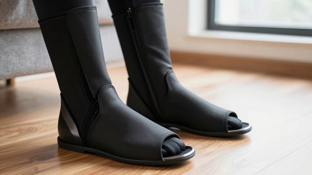 Yes, compression boots can help with chronic circulation issues by promoting blood flow and reducing swelling. I’ve seen firsthand how they improve circulation, especially for those who sit or stand for long periods. They work by gently compressing your limbs, encouraging better blood return to the heart. If you have ongoing circulation problems, I recommend trying compression therapy, but always consult with a healthcare professional first to make certain it’s suitable for you.