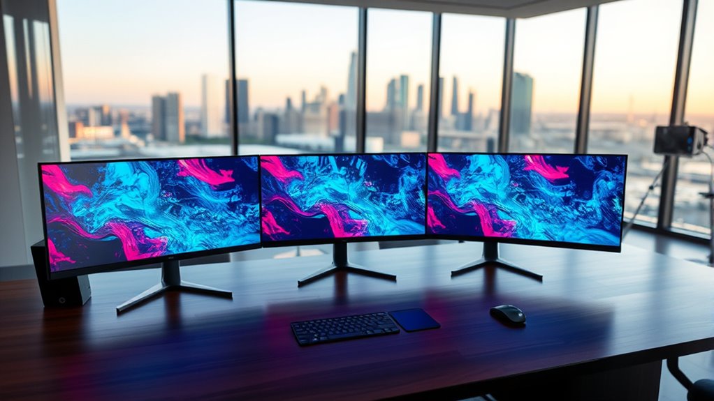 While exploring options for curved monitors, it’s essential to take into account resolution and clarity, as they substantially influence your immersive experience. Higher resolution displays, like 1440p or 4K, offer sharper, more detailed images that truly enhance clarity. On the other hand, monitors with lower resolutions, such as 1080p, can show pixelation or blurriness, especially on larger screens. A higher pixel density means crisper visuals, making text and fine details stand out. Additionally, HDR support can elevate perceived resolution by boosting contrast and color depth. Don’t forget about the panel quality—IPS, VA, or TN panels all affect color accuracy and contrast, which play an important role in clarity and depth perception. Choose wisely!