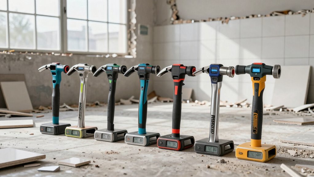 When selecting a demolition hammer for tile removal, I look for tools that offer multiple operational modes, such as hammer, drill, and chisel functions, because these boost versatility for different tasks. Adjustable speed settings and impact energy levels let me customize performance based on material and complexity. Compatibility with various chisel types—flat, point, or scaling—expands my options for demolition or surface prep. Features like tool-free bit changes and adjustable chisel angles make switching tasks smoother and reduce downtime. A versatile demolition hammer minimizes the need for multiple tools, streamlining my workflow and making projects more efficient. Overall, a multi-function tool adapts to different job requirements, saving time and effort while providing the flexibility needed for successful tile removal.