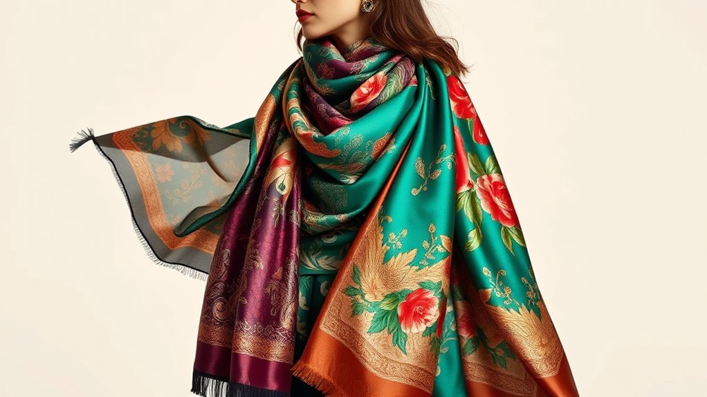 Selecting the right color and pattern for your designer scarf or wrap is essential to guaranteeing it complements your wardrobe and personal style. I recommend starting with your existing color palette—choose hues that harmonize with your go-to outfits. Vibrant, deep shades create a bold statement, while softer neutrals offer understated elegance. Patterns like floral, geometric, or abstract designs can change the vibe of your look, so pick one that matches your occasion and personality. Larger prints make a strong impact, perfect for making a statement, while smaller patterns add subtle detail that can elevate casual ensembles. Aligning your scarf’s pattern with your typical fashion aesthetic helps maximize versatility and ensures your accessory enhances your overall style seamlessly.