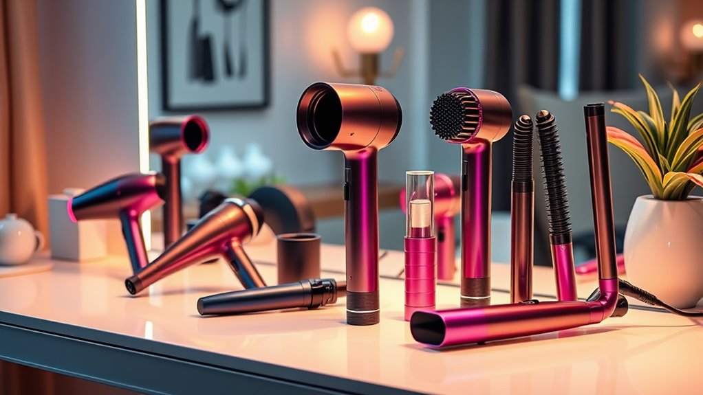If you’re looking to elevate your hair game in 2025, I recommend exploring some of the top Dyson styling tools like the Airwrap i.d.™, the Dyson Airstrait™ straightener, and versatile sets like the 7-in-1 Hair Dryer Brush. These tools combine advanced technology, multi-functionality, and sleek designs to help you achieve salon-quality results effortlessly. Curious about more options to transform your look? Stay tuned—there’s plenty more to discover.