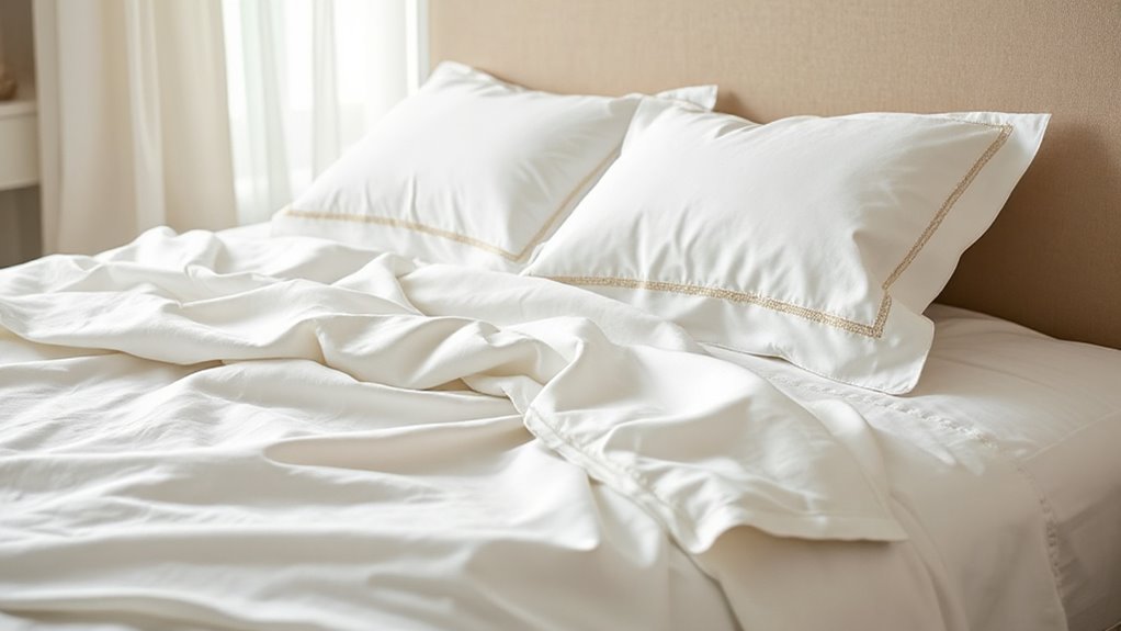 Have you ever wondered what makes Egyptian cotton sheets so comfortable? It’s mainly their breathability, which helps regulate body temperature and prevents overheating. Higher thread counts, like 600 or more, often provide better airflow thanks to their finely woven fibers. The natural fibers in Egyptian cotton promote airflow and moisture-wicking, keeping you dry and comfortable all night. Sateen weave fabrics feel silkier and are typically more breathable, enhancing comfort without sacrificing durability. Opting for sheets made from natural, unprocessed Egyptian cotton maximizes breathability, creating a cooler, more comfortable sleep environment. This breathability not only improves comfort but also ensures moisture doesn’t build up, helping you wake up feeling refreshed and dry.
