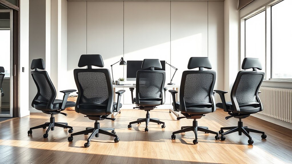 Ergonomic features are like a trusty anchor, helping to keep fatigue at bay during long work sessions. I’ve found that adjustable lumbar support, seat height, and armrests really make a difference. They promote better posture and blood flow, reducing strain. When I use a chair with these features, I notice less discomfort and more focus, proving that good design isn’t just comfort—it’s essential for sustained productivity.